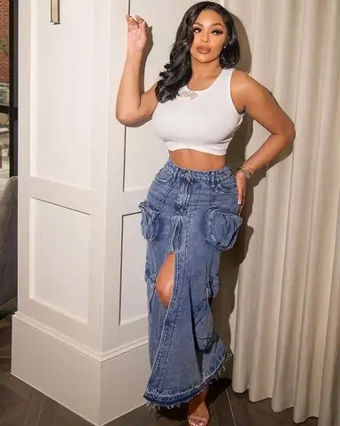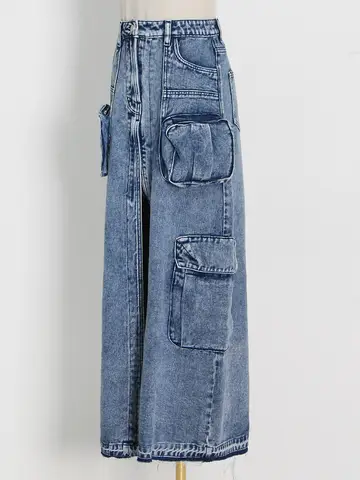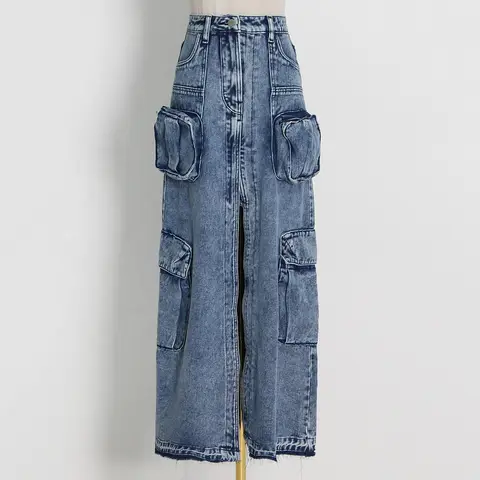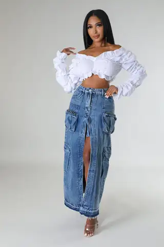 This Blue Denim Cargo Long Split Skirt is the perfect combination of fashion and functionality. Featuring an extra-long split cut and block pockets, this stylish skirt has plenty of space for all of your essentials. Enhance your wardrobe with this practical and fashionable piece.