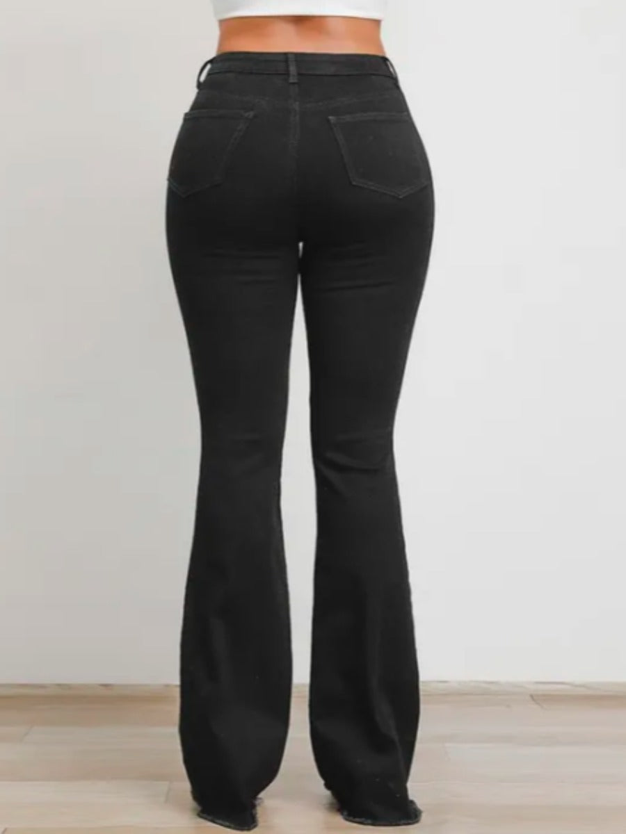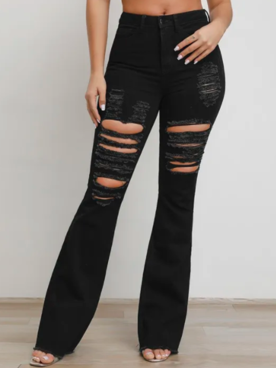 Denim Mid Waist Ripped Solid Boot Cut High Stretchy Jeans
