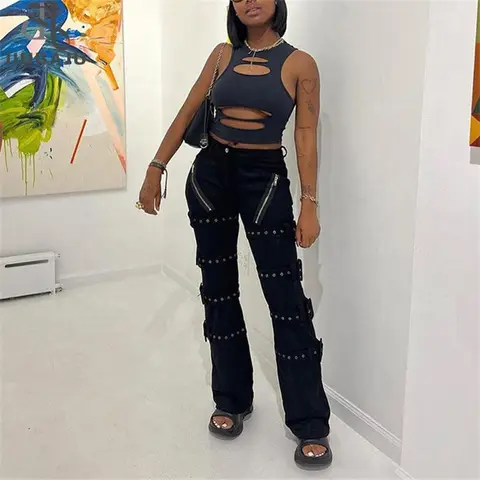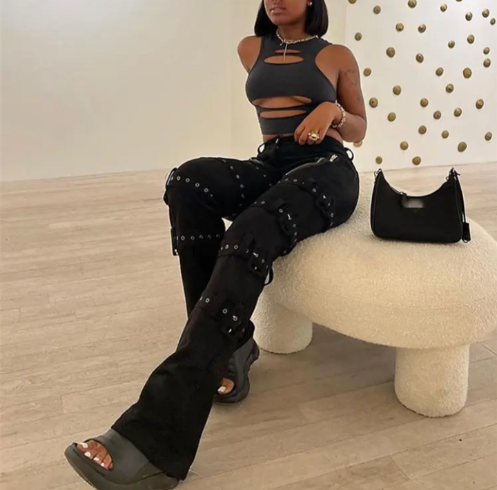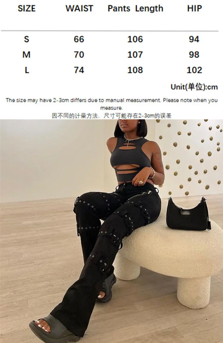 Elevate your style with our Eyelet Buckle Punk Goth Jeans. Featuring punk rock accents, buttons, and zippers, these edgy jeans are perfect for any rebel at heart. Unleash your inner punk and make a statement with these unique jeans.