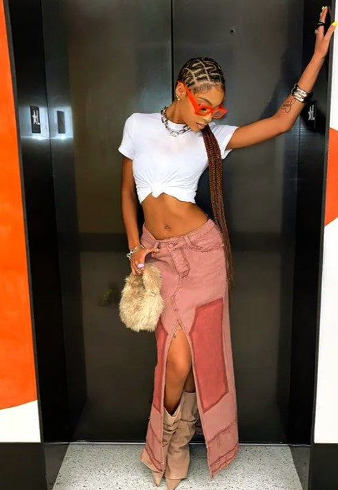 Kiki's Ankle length Patchwork Skirt is made with durable patchwork denim for lasting comfort. Its ankle length and long split offer an elegant, stylish look. Perfect for casual wear or nights out.