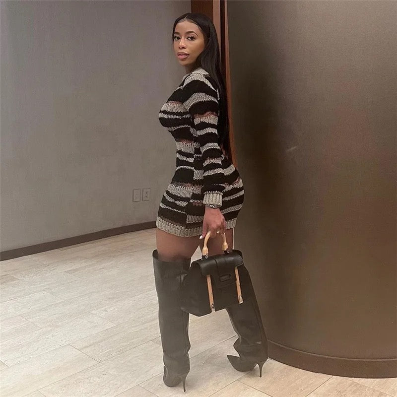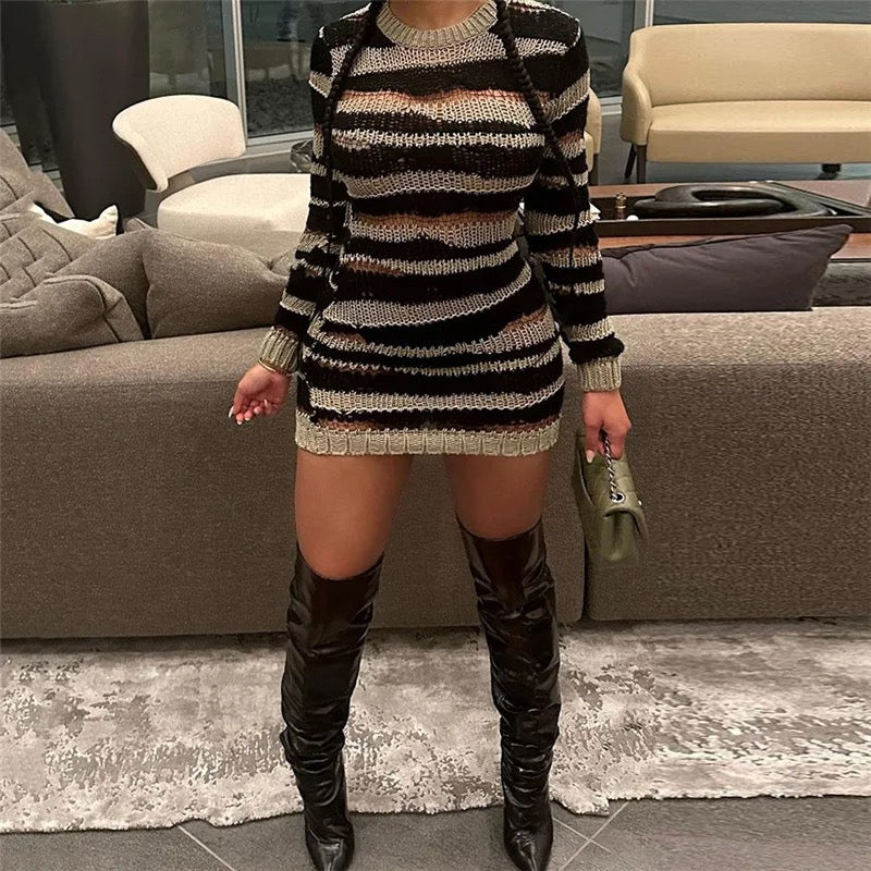 Elevate your style game with our Knitted Strip Ripped Bodycon Dress! Made from knitted ripped material, this dress is not only eye-catching but also perfect for those looking to make a statement. With its long sleeves and figure-hugging fit, it's the ultimate party dress that will have you at the center of attention all night long! Take your wardrobe to the next level and add this dress to your collection now!