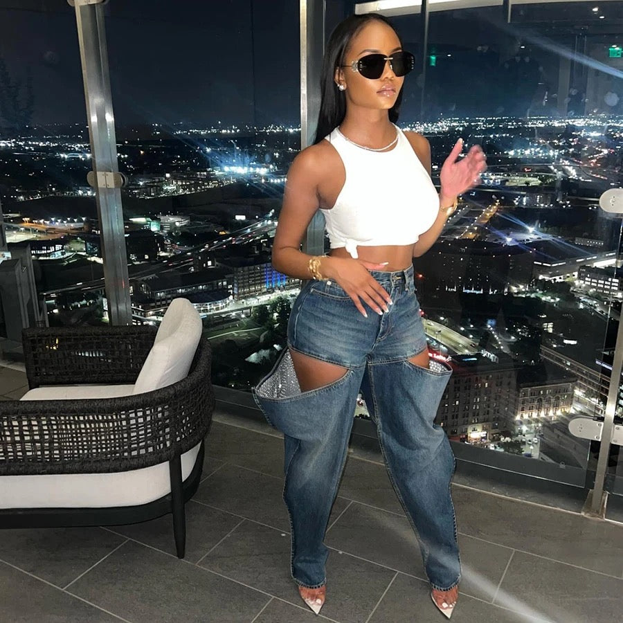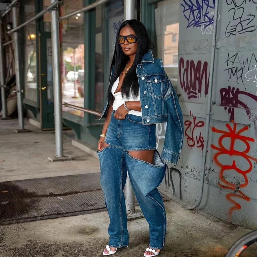 "Experience a unique fashion statement with LETNES' Open Thigh Denim Pants. Featuring an eye-catching open leg style, these pants are sure to captivate others' attention. Perfect for summer, these pants also provide a comfortable and stylish option for any occasion. Stand out from the crowd with LETNES' Open Thigh Denim Pants!"