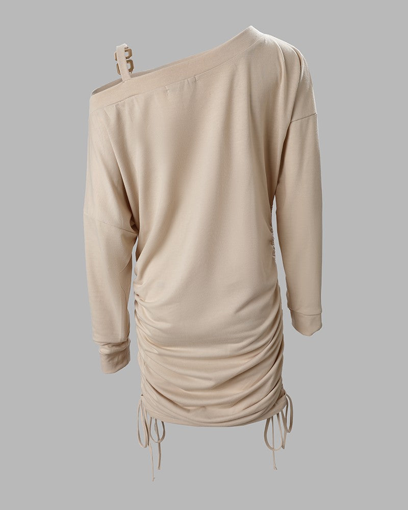 Letter Print Cold Shoulder Drawstring Long Sleeve Dress