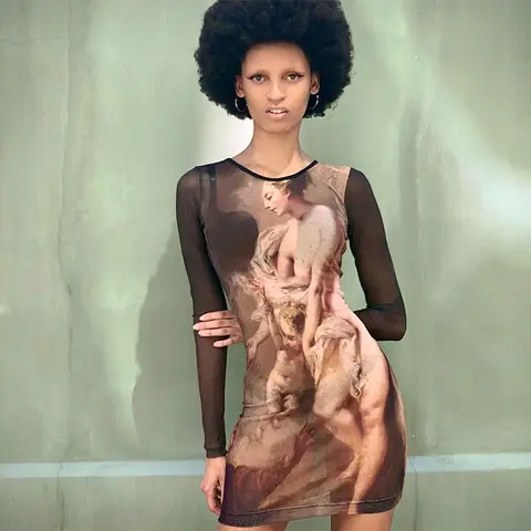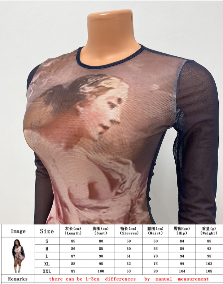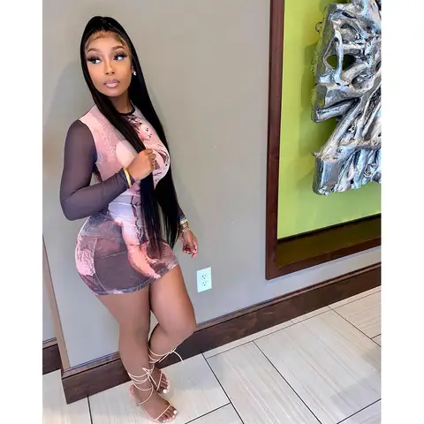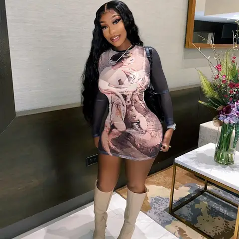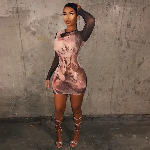 Long Sleeve Tie Dye Printed Round Neck/ High Waist Bodycon Dress