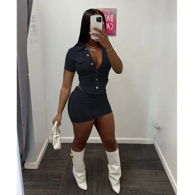 Upgrade your wardrobe with our exclusive Spring Body Skirt Set. The V cut button up shirt adds a trendy touch to your look, perfect for a chill day out or a night in the city. Elevate your style with this must-have set.