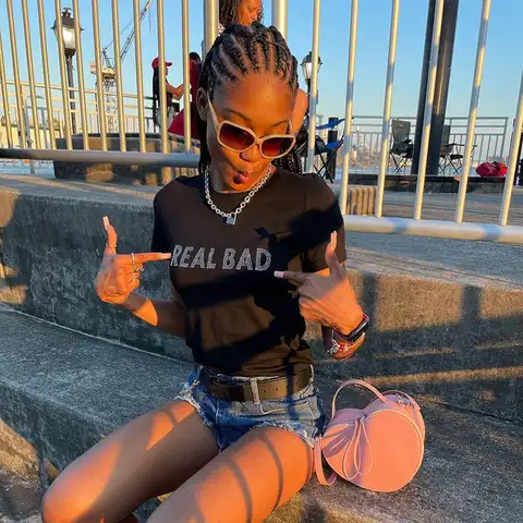 The On Me Real Bad Crop-Top Shirts are a stylish choice for any fashionista. These shirts feature a crop top with short sleeve and designer style. Bright rhinestone printed letters give each piece an eye-catching finish. Create a fashion-forward look that can be dressed up or down.